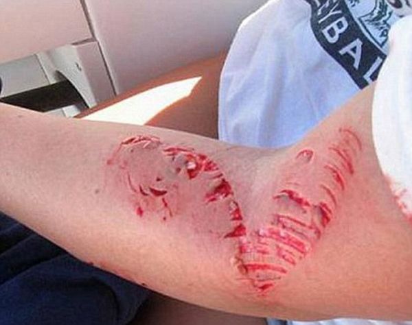 a mae dela ainda disse que o braco dela ficou parecendo um hamburger cru!